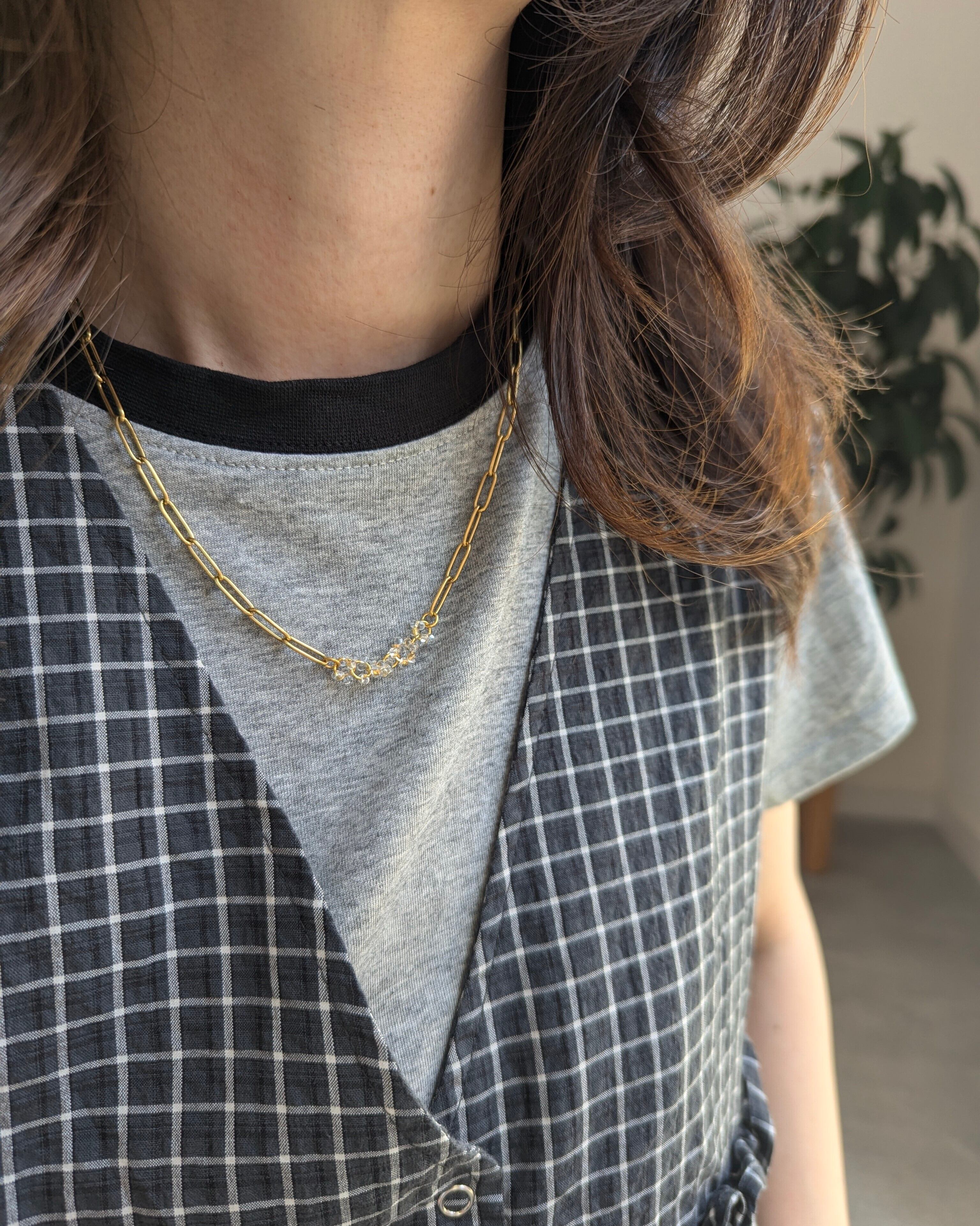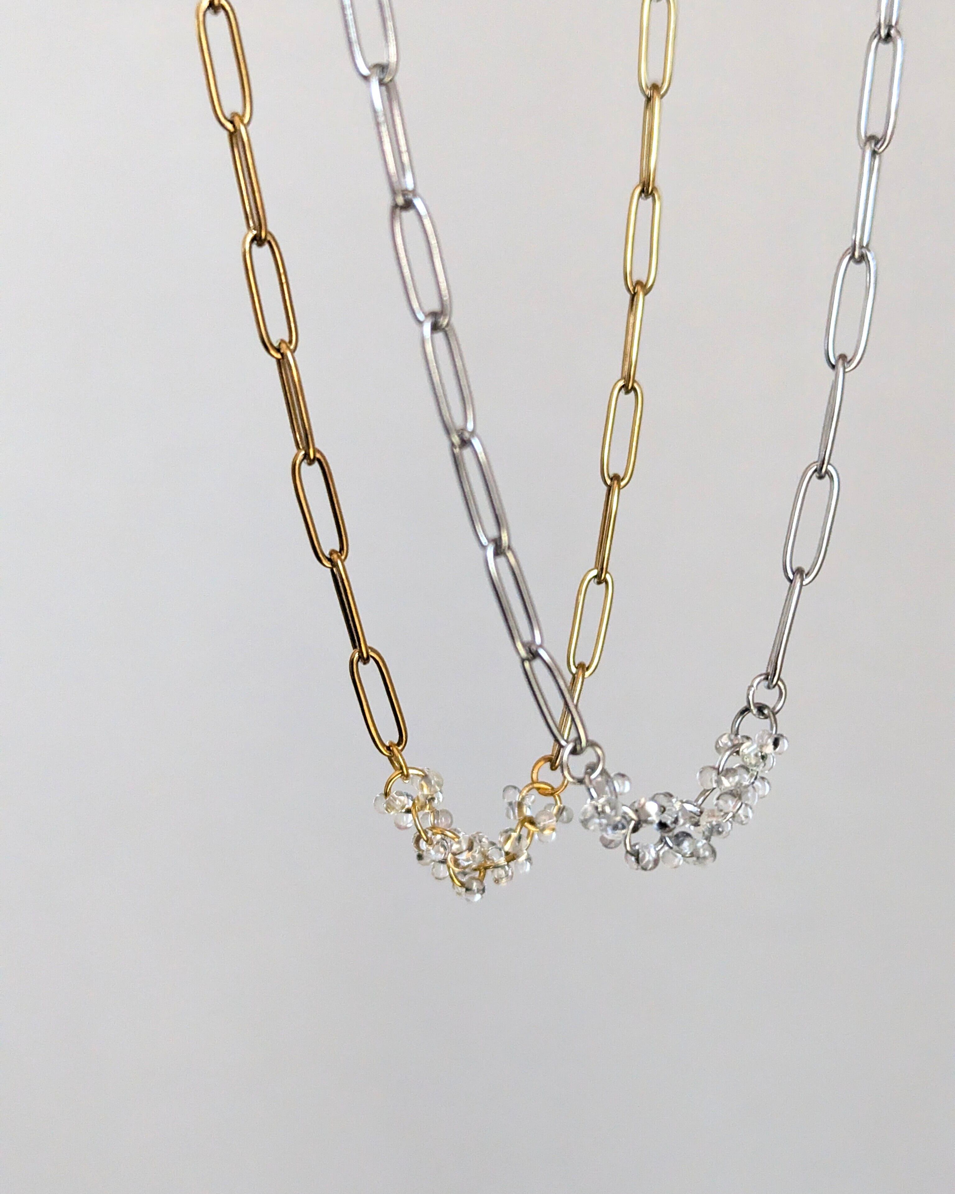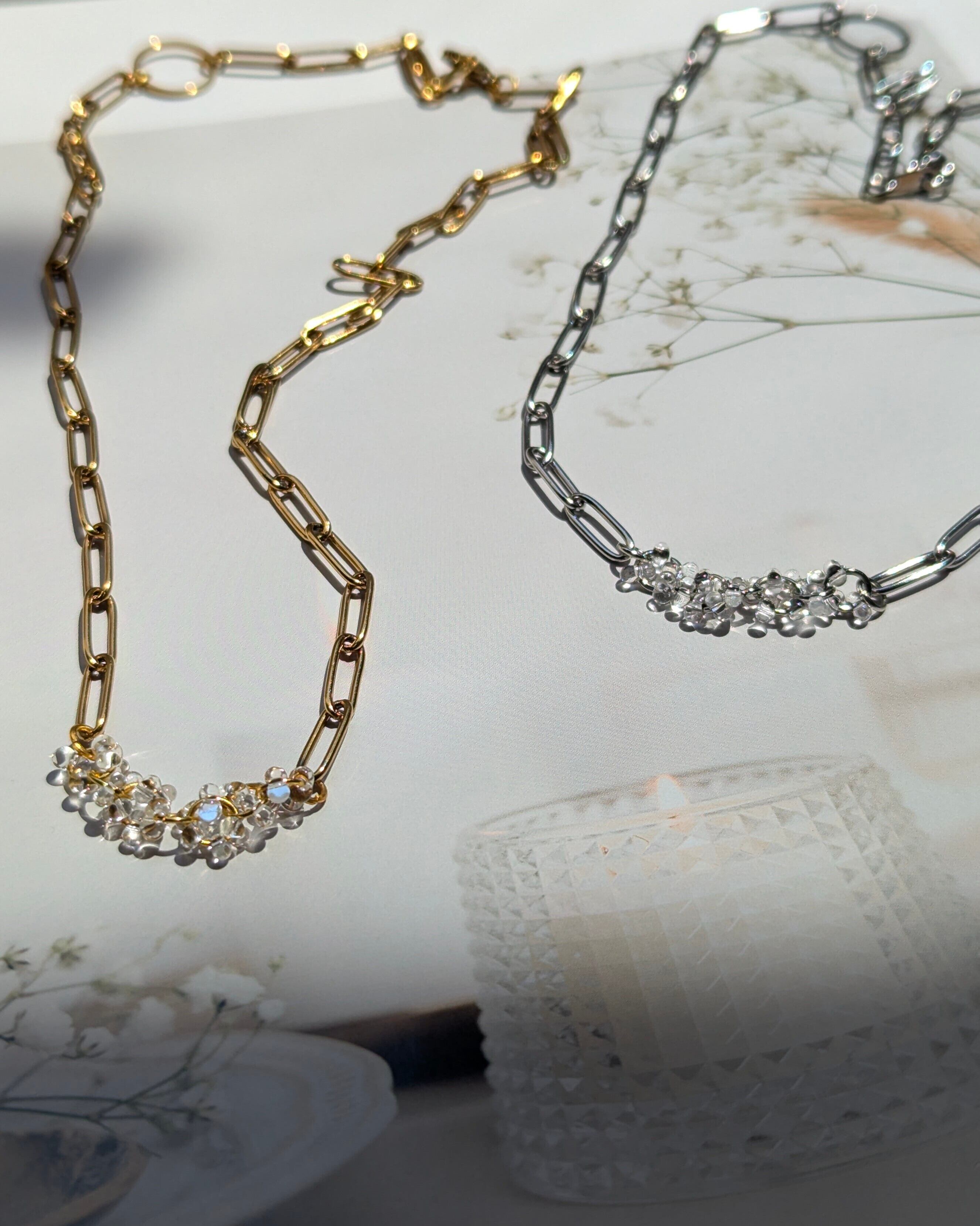 光に当たるとよりキラキラ輝き透明感あふれるネックレスです